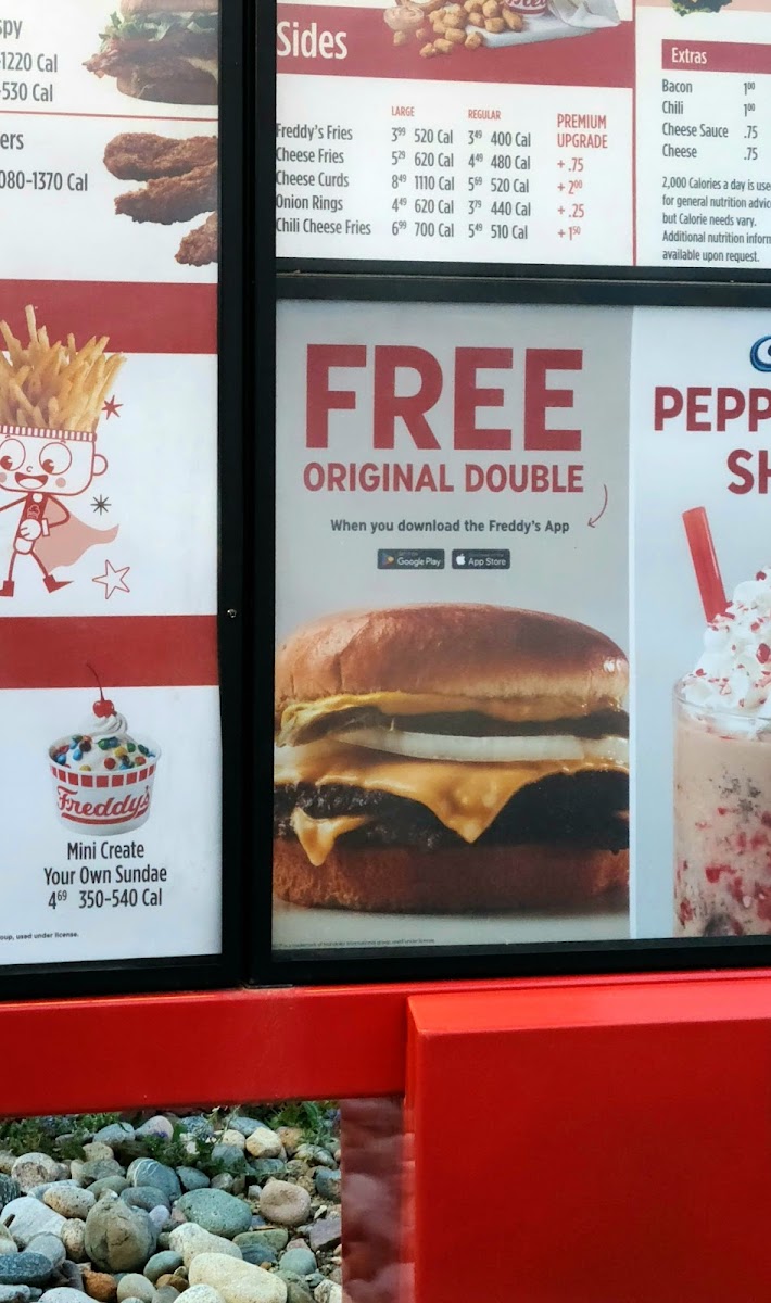 Served with Freddy's fries, Baked Lays® or Mott’s® Natural Applesauce and Milk, Water, or the drink of your choice.